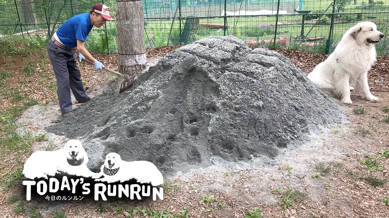 砂山のある位置は母屋とは対角の一番済の場所です。グレートピレニーズは元々見通しの良い場所から羊の群れを外敵から守るために使われる犬です。ルンルンとアランも普段は敷地が見通せる場所で番犬をしています。砂山の場所は番犬をするには最適です。