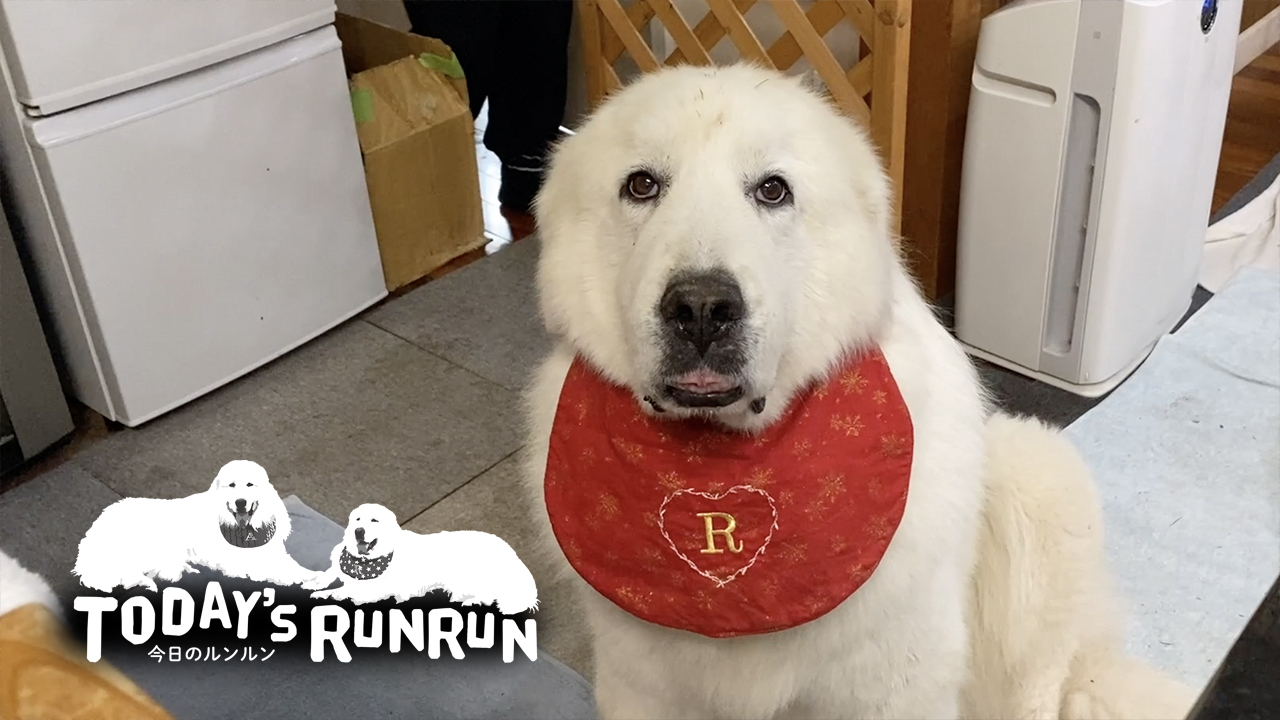 ルンルンはグレートピレニーズにしては大きな目をしています。大きな目でジッとおやつをねだられると、ついついおやつをあげたくなってしまいます。1日の中の数少ないおやつのチャンスを逃すまいと、今日も一生懸命人間を見つめるルンルンです。