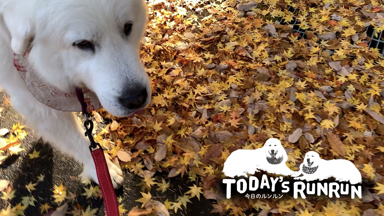 先日まで見頃だった紅葉は段々と散り始め、今は足元に積もった落ち葉達が見頃です。赤や黄色の落ち葉が敷き詰められた散歩道を、真っ白なルンルンとアランが歩くととても目立ちます。この時期しかみられない特別な風景です。