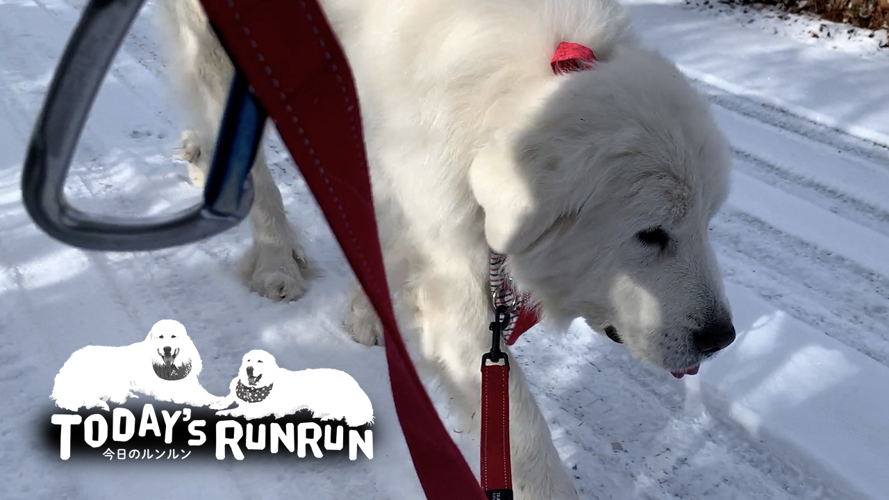 この前まで紅葉で色づいていたルンルン地方の散歩道、冬になり雪が降ってガラッと景色が変わってしまいました。雪の朝、天気が良いと白い雪がキラキラ光ってとても綺麗です。穴掘りをするルンルンと、体にゴミが付きやすいアランは何となく汚れていて、雪とくらべると流石に白さで負けてしまいます。