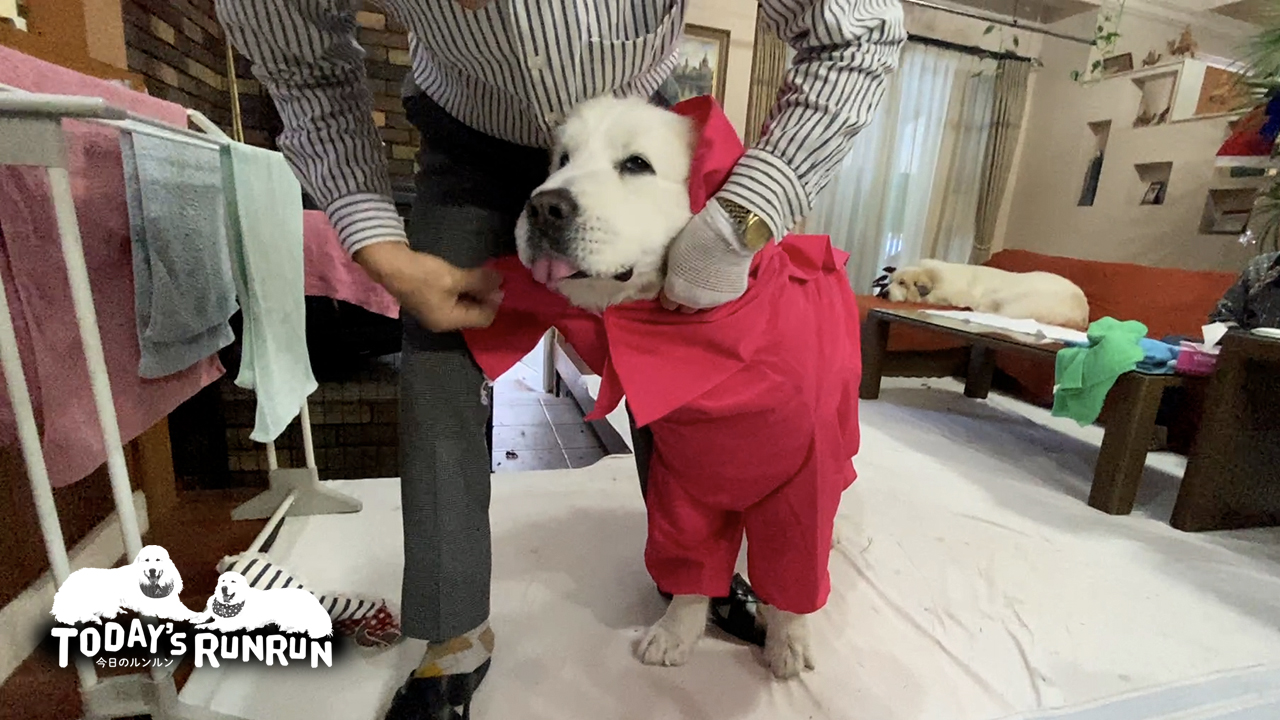昨年末にオーダーに行ったレインコートの仮縫いが届き試着しました。グレートピレニーズ超大型犬のため既製品のレインコートがあまりありません。ルンルンとアランは散歩中にトイレをするため、健康的なルーティーンのため雨の日もなるべく散歩へ出るようにしています。濡れてしまうと乾かすのが大変なのでレインコートが必要です。