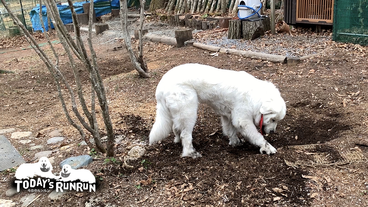 Father cleaned up the garden for spring. RunRun, who was watching nearby, also worked(Digging) hard.
