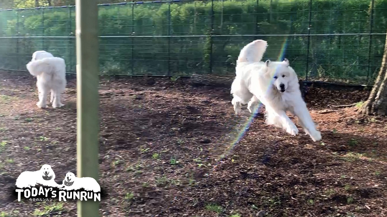 朝はドッグランで番犬をするのがお決まりのルンルンとアラン。アランは久しぶりに軽トラさんと対決しました。