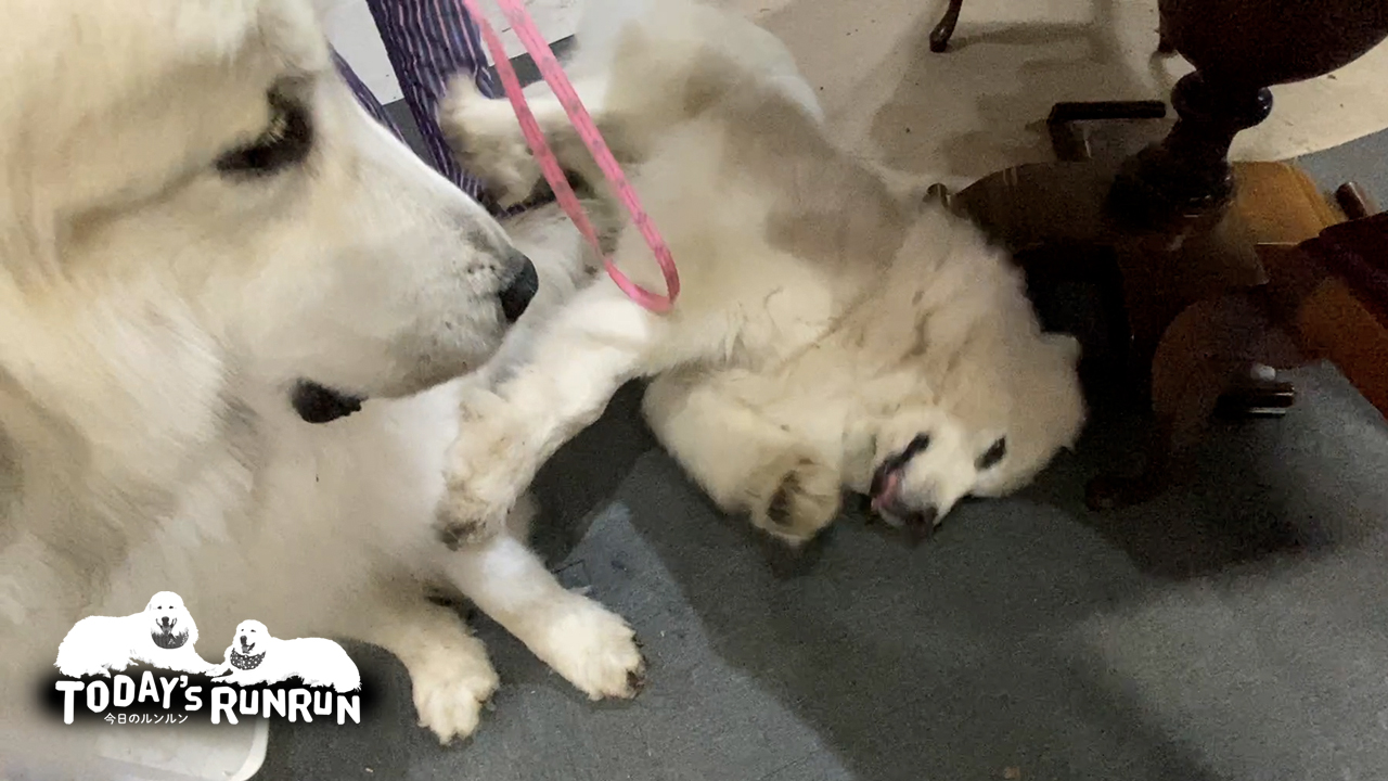 夜中に泥足で帰ってきたルンルンとアラン。ふたりとも夜中のブラッシングは面倒くさいようで拒否しました…が、リードを付けられて観念しました。