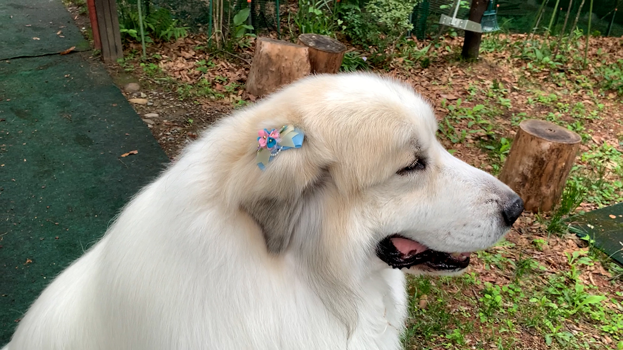 せっかく着けてもらったリボンですが、当日数時間ですぐに片方取れてしまいました。ルンルンがアランのリボンを取る事は無いので、恐らく自分で取ってしまったんだと思います。アランの毛は細い毛なので滑って取れてしまったのかもしれません。