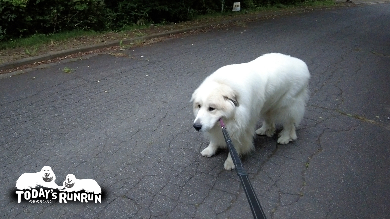 息子(格下)の引くリードは少し抵抗するアラン。グレートピレニーズは主人を厳しく選ぶ犬種。息子はやはり格下に見ているのかもしれません。