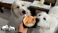 ルンルンとアランはだいたい月に1回のペースでシャンプーをしています。あとは毎日お父さんがブラッシングをしています。グレートピレニーズはダブルコートの長毛種。手入れをしてあげないとすぐに毛が絡まって毛玉になったり、毛がボソボソしてしまいます。手入れは大変ですが、ちゃんと手入れをしてやるとモフモフでフワフワな見事な姿になります。