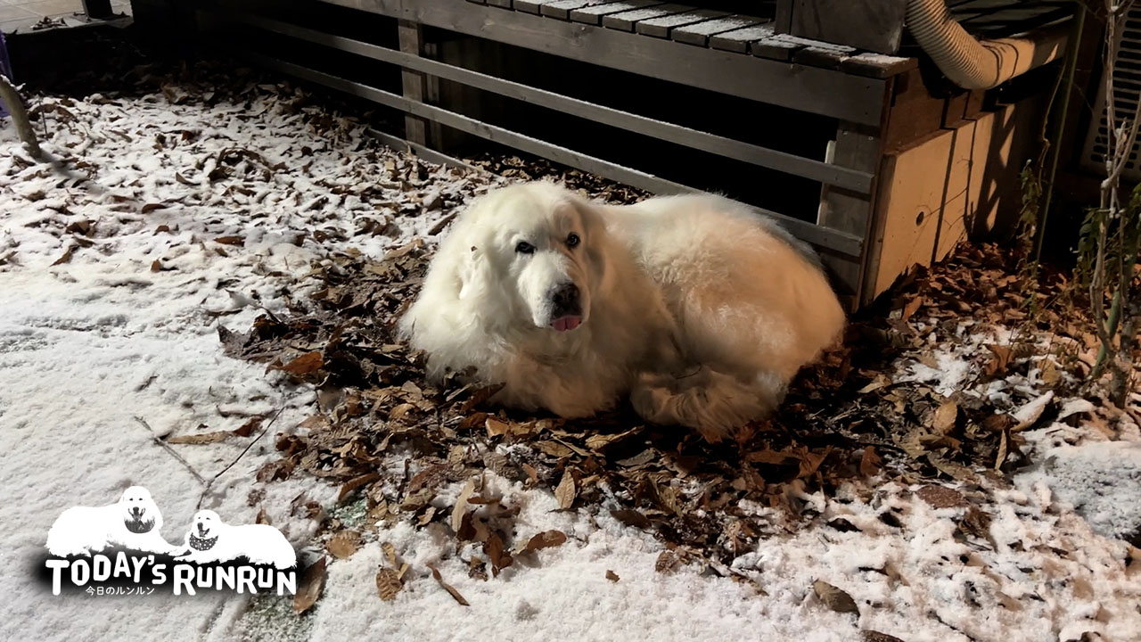 寒いのが得意なグレートピレニーズ。雪が降っても平気で外で寝ているルンルンです。