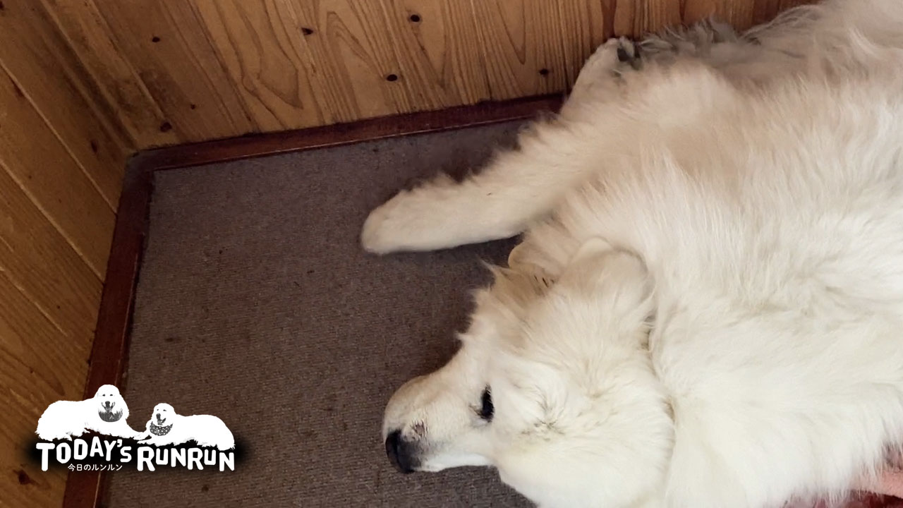 いつもはお父さんをお出迎えするルンルンですが珍しくグッスリ寝ていたようです。冬なので気温がちょうど良かったのか疲れていたのか…お父さんに声をかけられてはじめて気づいたルンルンです。