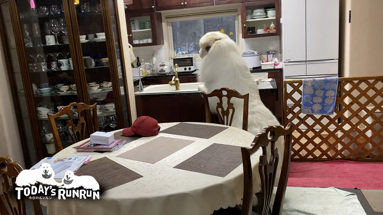 アランはいつもルンルンのおイモを横取りしようとします。ルンルンが外に出てゆっくりおイモを食べるのはアランに取られないようにするためなのかもしれません。お父さんがお芋のタッパーをキッチンカウンターに置きっぱなしなのを見逃さなかったアランは、ルンルンのおイモよりもカウンターのおイモを全部盗ろうとしました!