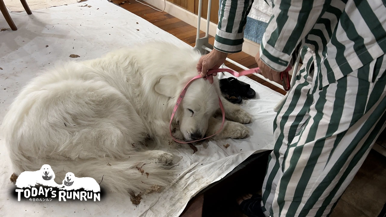 落ち葉だらけで帰ってきたルンルン。お父さんにブラッシングと言われましたが夜で眠かったのか拒否しようとしたルンルンです。