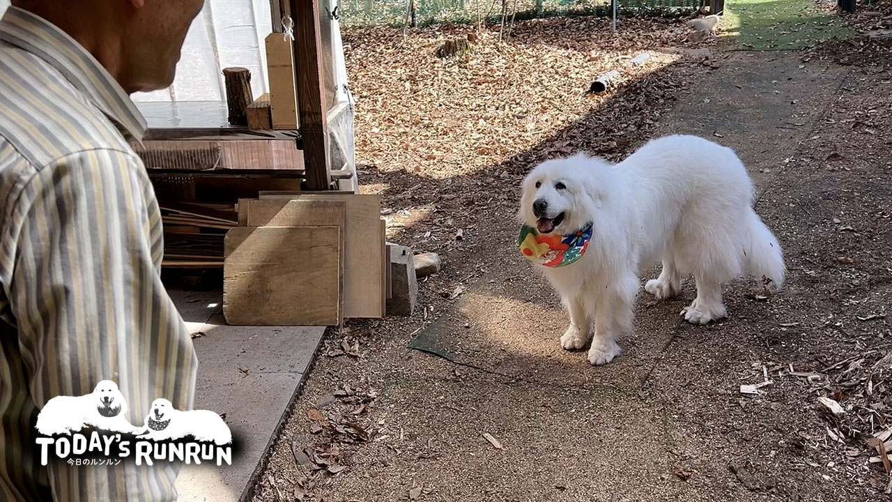 急に暑くなったので犬舎を冷やしたお父さん。ルンルンに犬舎に入るように言いますが、ルンルンは外で遊びたいようです。