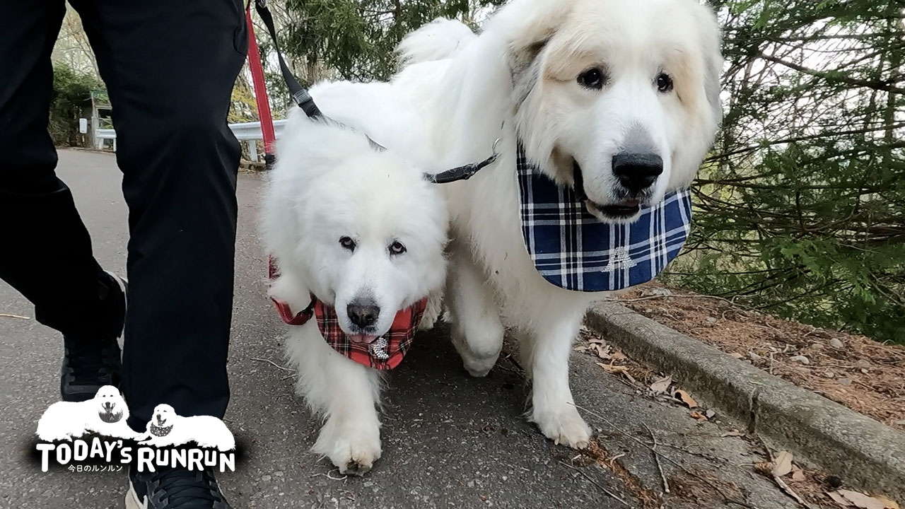 お父さんが静養中なのでまだ息子(格下)と散歩しているルンルンとアラン。もう少ししたらお父さんもリハビリがてら散歩に合流する予定です。