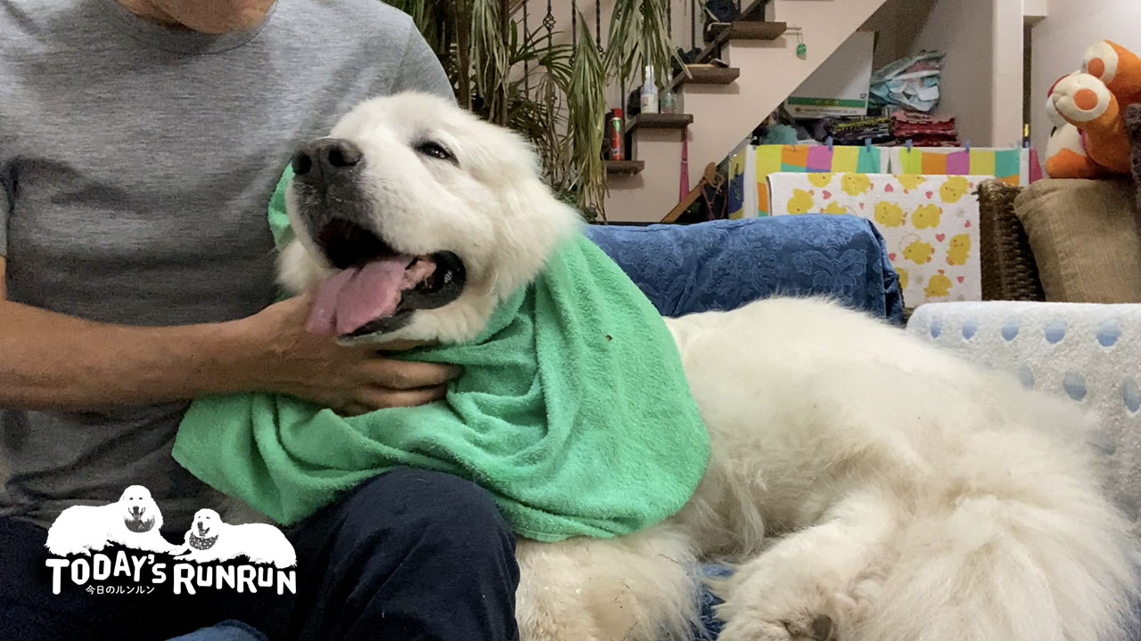 割と強気な性格でアランや自分より体格の大きいピレニーズにも臆さないルンルンですが、唯一雷は大の苦手です。雷がなると震えとよだれが止まらなくなってしまいます。近くに誰かが居ると安心するみたいなので、雷の予報が出た時や空の雲行きが怪しい時は人間が誰かしか家に帰りルンルンの近くにいるようにしています。