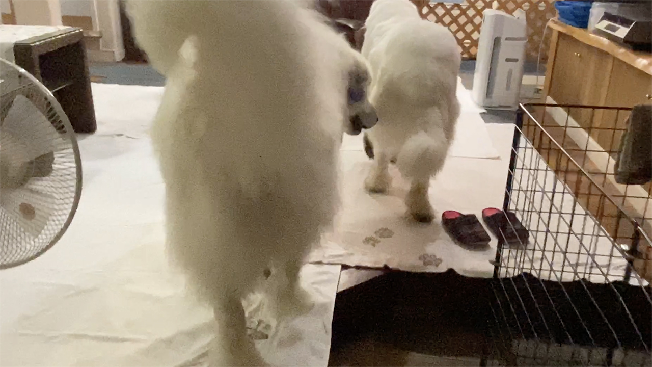 この日は外で雨が降っていて庭がぬかっていたみたいで、ルンルンとアランの脚が汚れていました。それに気づかず家に入れてしまったお母さん…せっかく新しくしたタオルに足跡がついてしまいました…