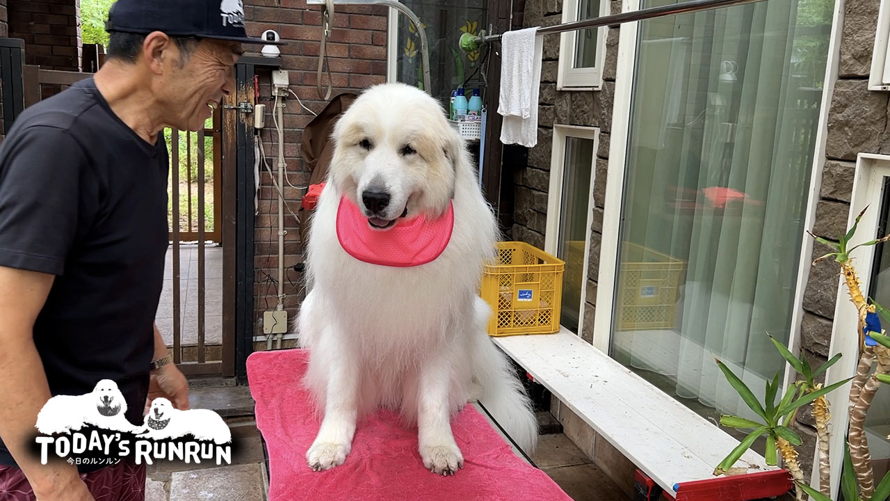 ルンルンとアランがしているスタイ(よだれかけ)は実用的な用途があります。グレートピレニーズは比較的ヨダレが多い犬種です。このためヨダレが胸元の毛についてしまいます。特にルンルンは土の上で寝るため、スタイをしていないとヨダレに土がついてそれはもう汚れます。