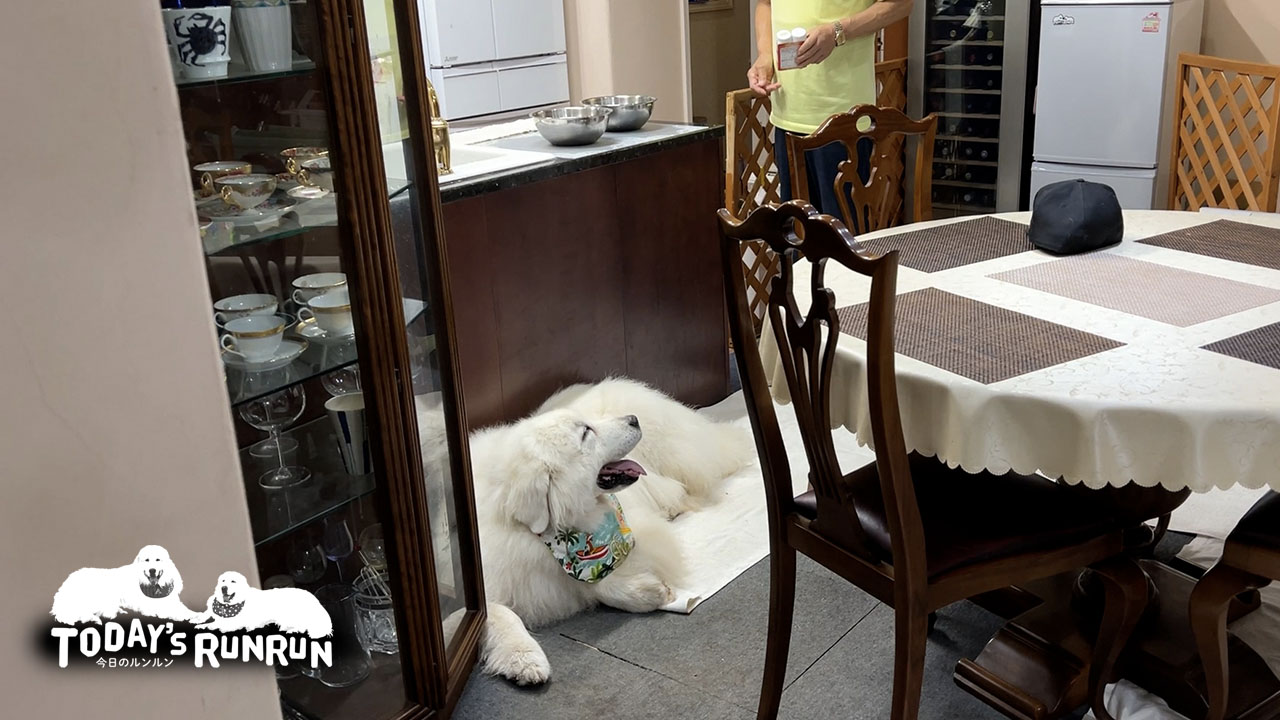 毎日だいたい同じルーティンで動いているルンルンとアラン。食事の時間になるとルンルンは流し台のすぐ裏、アランはソファーの決まった場所で待機をします。食事の前は必ず薬を飲むのが決まり。お父さんが声をかけるとルンルンは直ぐにお父さんの所へ行きお利口に薬をの飲みます。