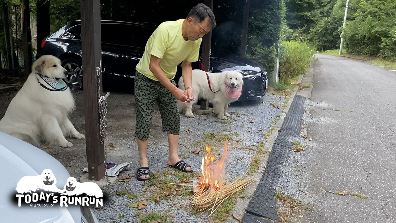 迎え火を焚くとルンルンとアランは不思議そうに煙をみていました。ただ単に煙が不思議なのか、エスやタローを感じ取ったのかわかりませんが、お利口に迎え火を見ていました。