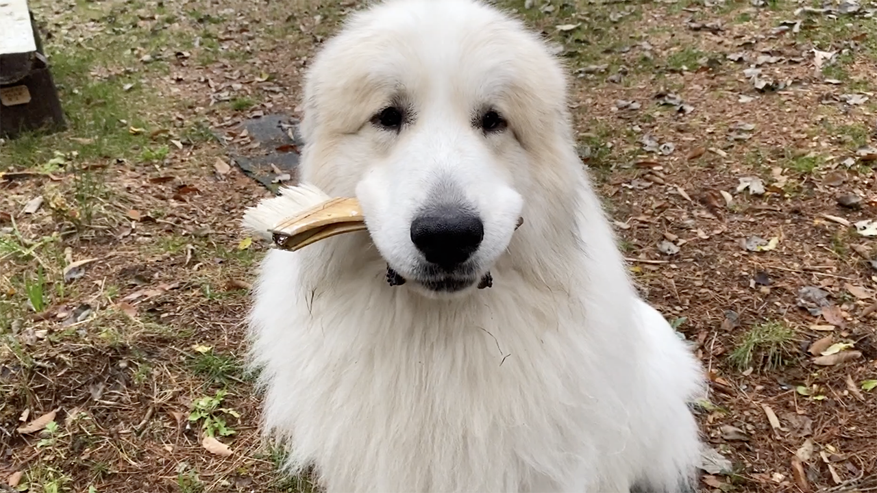 お父さんの日曜大工のハケを持ち出したアラン。誰かが通ると番犬をするアラン。朝から忙しいアランです。
