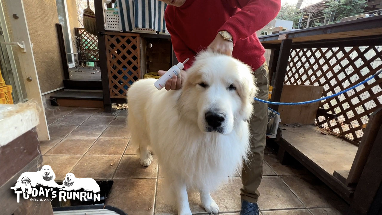 グレートピレニーズはたれ耳なので耳の中が蒸れて病気になってしまう子もいます。ルンルン家では獣医さんの薦めで2ヶ月に1回程度耳の薬をつけています。また、耳の奥の方はとてもデリケートのようで、毎日のブラッシングでも耳の奥の方までは手をつけず、耳の掃除はシャンプーの時にプロのトリマーさんに任せています。