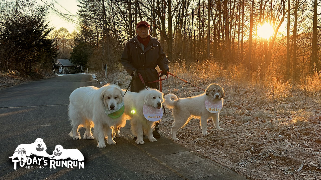 元旦の天気が良さそうだったので、初日の出のタイミングに合わせてお散歩をしたルンルンとアランとベル。太陽が登るちょうど良い時間に目当ての場所を通過し初日の出を背にお散歩する事ができました。
