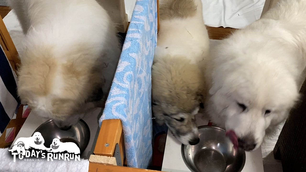 グレートピレニーズは超大型犬のため体重の管理がとても大事です。体重が増えすぎると関節を痛めてしまいます。ルンルンは一時期体重が増えすぎてしまい足を痛めてしまった事がありました。その時の反省からルンルン、アランの体重は理想体重をキープする様に定期体重測定をして管理しています。