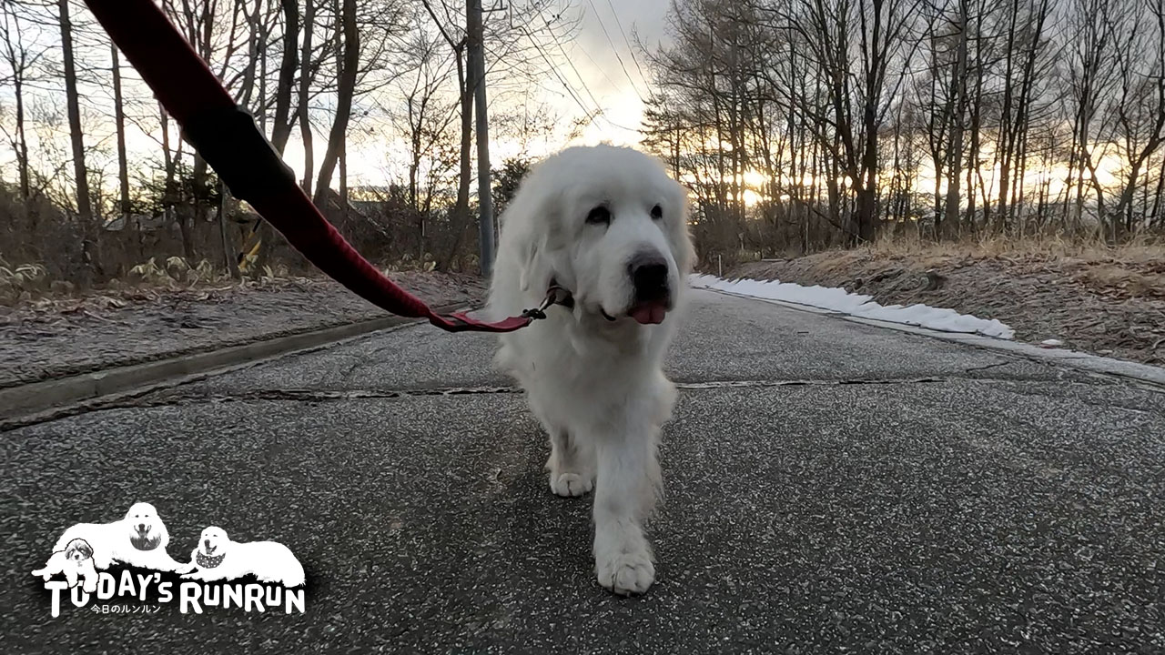 グレートピレニーズは1日中走り回るような犬種ではありませんがある程度の運動は必要です。毎日2回程度の散歩が推奨されています。ルンルン家でも朝と夕方の2回散歩へ行っています。ルンルンは12歳のシニア犬ですがまだまだ足腰は丈夫で、散歩のペースもアランやベルに引けをとりません。