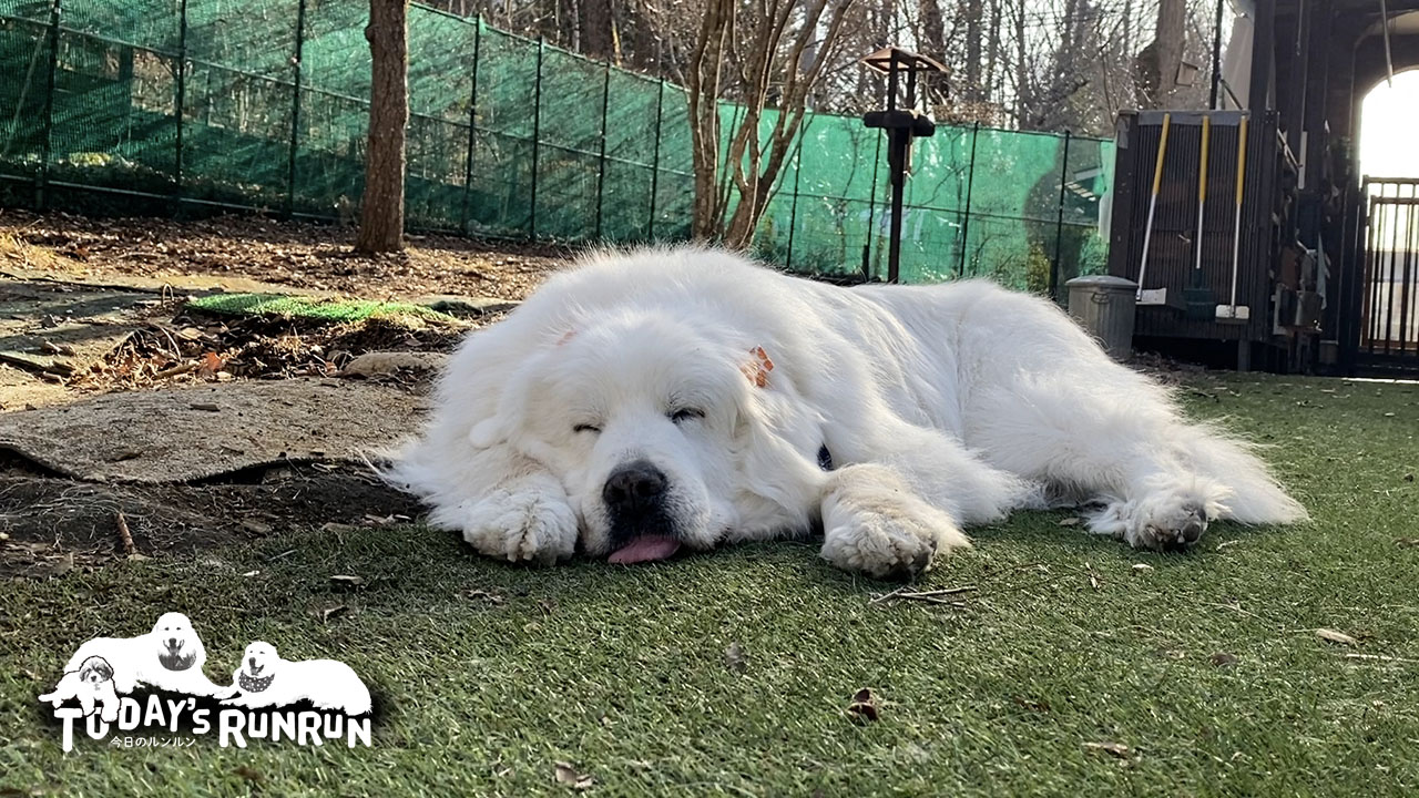 ルンルンには敷地内のお気に入りの場所が管箇所かありますが、今の時期はドッグラン全体どこでも心地よいようで思い思いの場所でゴロリと横になり眠っています。ルンルンはちゃんと番犬もしているので、ある程度ドッグランが見渡せる場所に陣取り周囲を警戒しながらそのうちにウトウトして寝落ちする…といった毎日です。