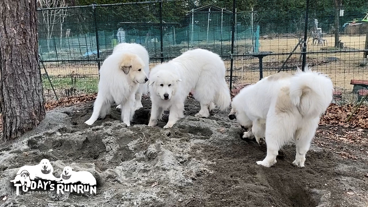 暖かくなり地面が柔らかくなってきたのでぼちぼち穴掘りを始めたルンルンとベル。ルンルンとベルが砂場で穴を掘っていると珍しくアランも加わりました。まだ土の部分は硬くて掘りづらいためとりあえず砂場で肩慣らしをはじめたルンルン、アラン、ベルです。
