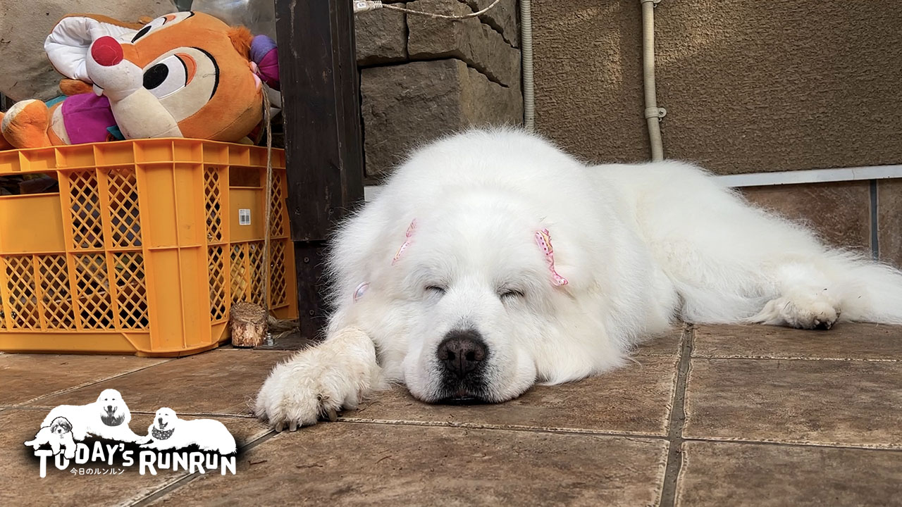 グレートピレニーズは暑いのが苦手なので真夏はほとんど外に出られません。適正温度は5℃ぐらいだそうです。ルンルン達も20℃を超えると少し暑そうにしはじめ、23℃を超えるとゼーゼーしてきます。春先の今の時期は外気温が10-15℃程度なのでルンルン達にはとても過ごしやすい季節のようです。