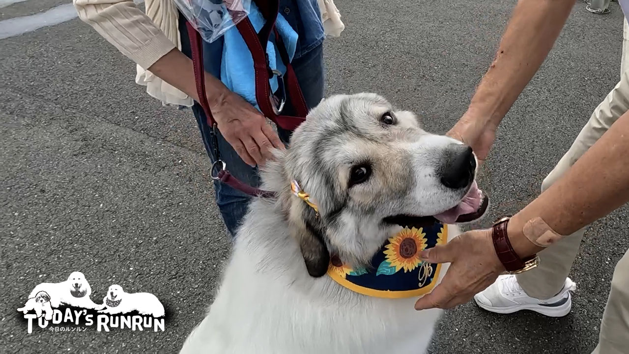 ドッグショーで大活躍だったベル。ショーの後に家族と再会して大喜びでした。いつものようにお父さんとお母さんに飛びついてハグをして、お揃いで作ったひまわりのスタイを着けてもらいルンルンとアランと合流しました。