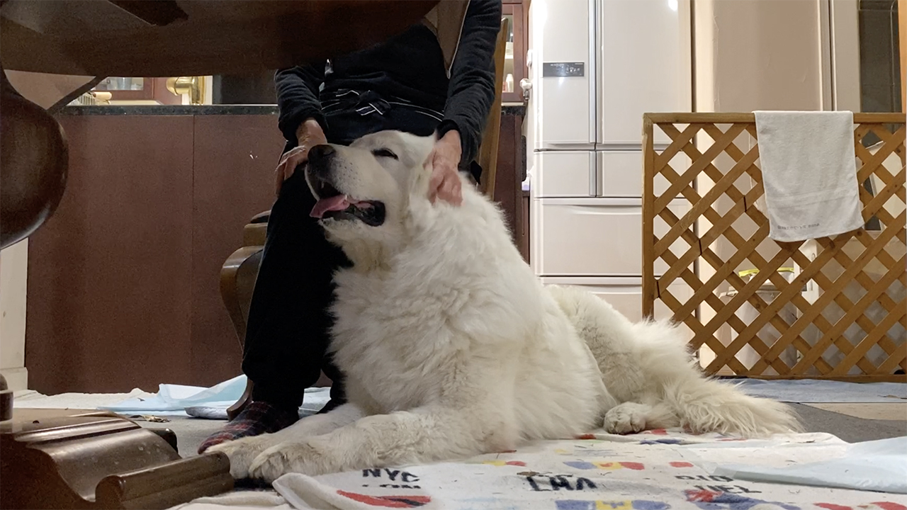 ルンルンがなでてもらうのが好きなのは我が家に来た頃からずっとです。グレートピレニーズは独立心が強くあまり人間にはベタベタしないのが本来だそうです。時には飼い主を試し自分が優位に立とうとしたりするちょっとプライドが高い躾が難しい犬種です。