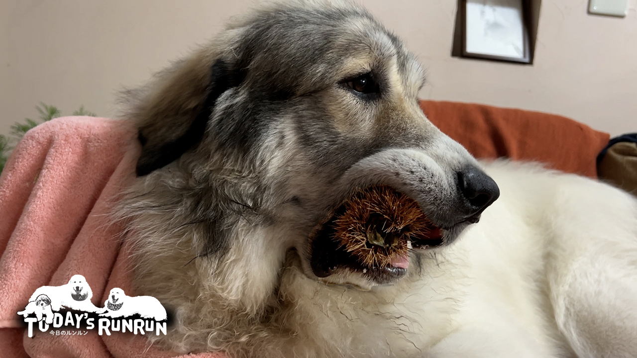 イガグリは落ち葉の中にも紛れているため、ルンルンやベルが落ち葉の中で寝ていると稀に毛に絡まって体についてしまう事があります。グレートピレニーズは毛が厚いので本人達はあまり気にならないようですが、場所によっては痛がる事もありますし、人間が撫でた時に手に刺さって危険だったりします。
