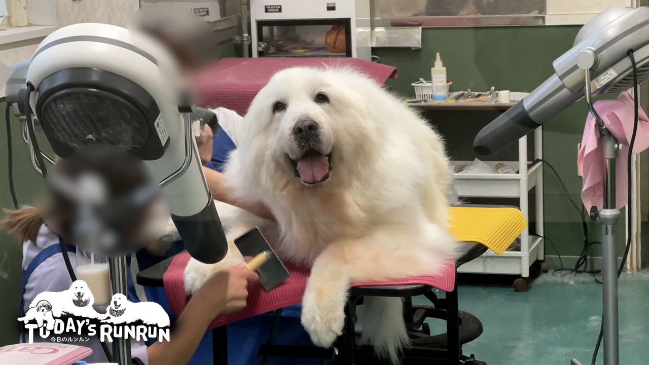 ルンルンはもともと撫でてもらうのがとても好きです。グレートピレニーズはプライドが高くあまり人間にベタベタしない犬種なのですが、ルンルンは例外でとても甘えん坊です。自分から撫でろと人間に催促するぐらい人間に撫でてもらうのが好きです。なのでシャンプーやトリミングのように人間にずっと触られるのはむしろ好きなのかもしれません。