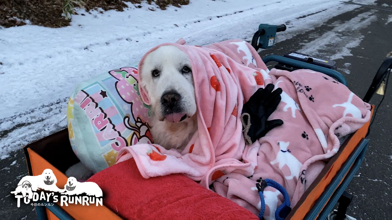 寒さに強いグレートピレニーズですが零下になると流石に長時間外にはいられません。毎朝ルンルン号ミニEVで朝のお散歩に参加するルンルンですが、ルンルンはほとんど自分では動かないため、ブランケットをマチコ巻きにしてポカポカ装備で散歩へ向かいます。
