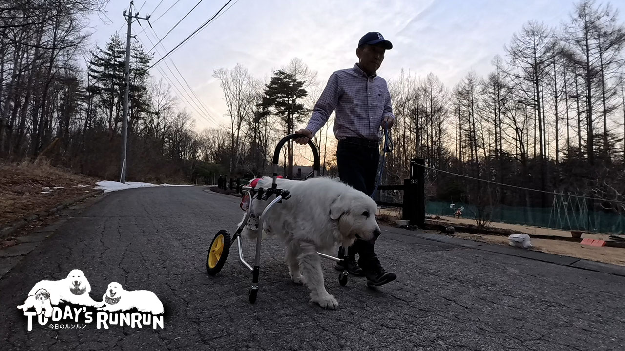 ルンルンは犬用車椅子でだいたい800〜900mほど歩いています。頻度は週に2回程度です。散歩道は適度な勾配もあり上り坂と下り坂にになっておりいいトレーニングになります。わずかな距離ではありますがそれでもルンルンにとってはいい運動になります。