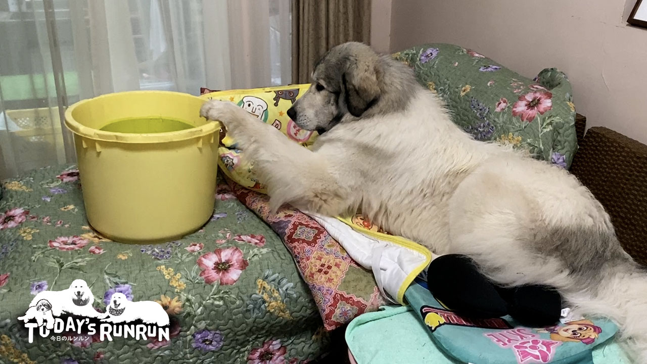 庭に置いてあった漬物桶を部屋に持ち込んだベル。ソファーに持ち上げてガジガジかじりました。