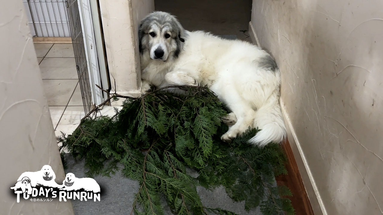 だんだんと暑くなってきて山の木々も茂ってきました。お父さんがドッグランの木を剪定しましたが、枝を片付ける前に雨が続いたため枝を片付けられずに放置していました。それに目をつけたベルは毎日せっせと枝を家に運び込みました。どういうわけかベルは外にあるものを家に持ち込むのが好きなようです。