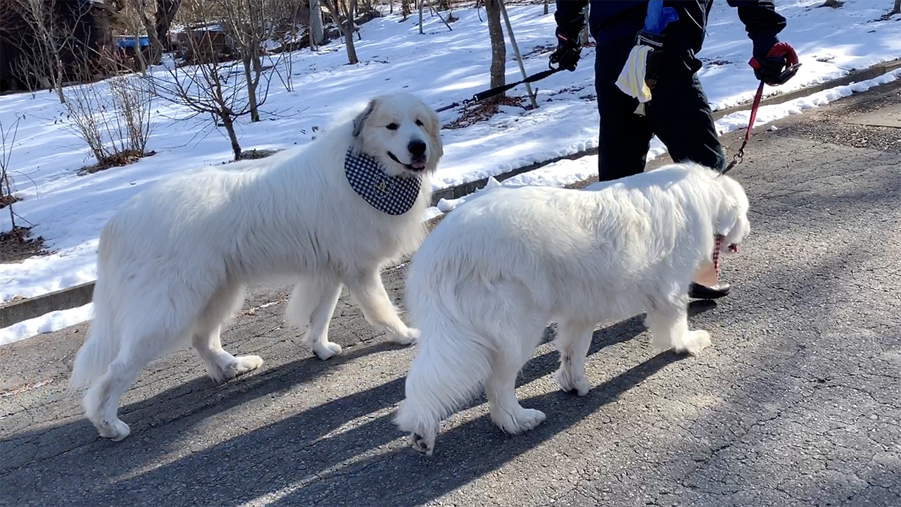 ルンルンは散歩に呼ばれると小走りでやってきてすぐに散歩へ向かいます。アランは行きたくないアピールをするのですが、置いていかれてしまうとヒーヒー泣いてやっぱり行きたいと慌てだします。