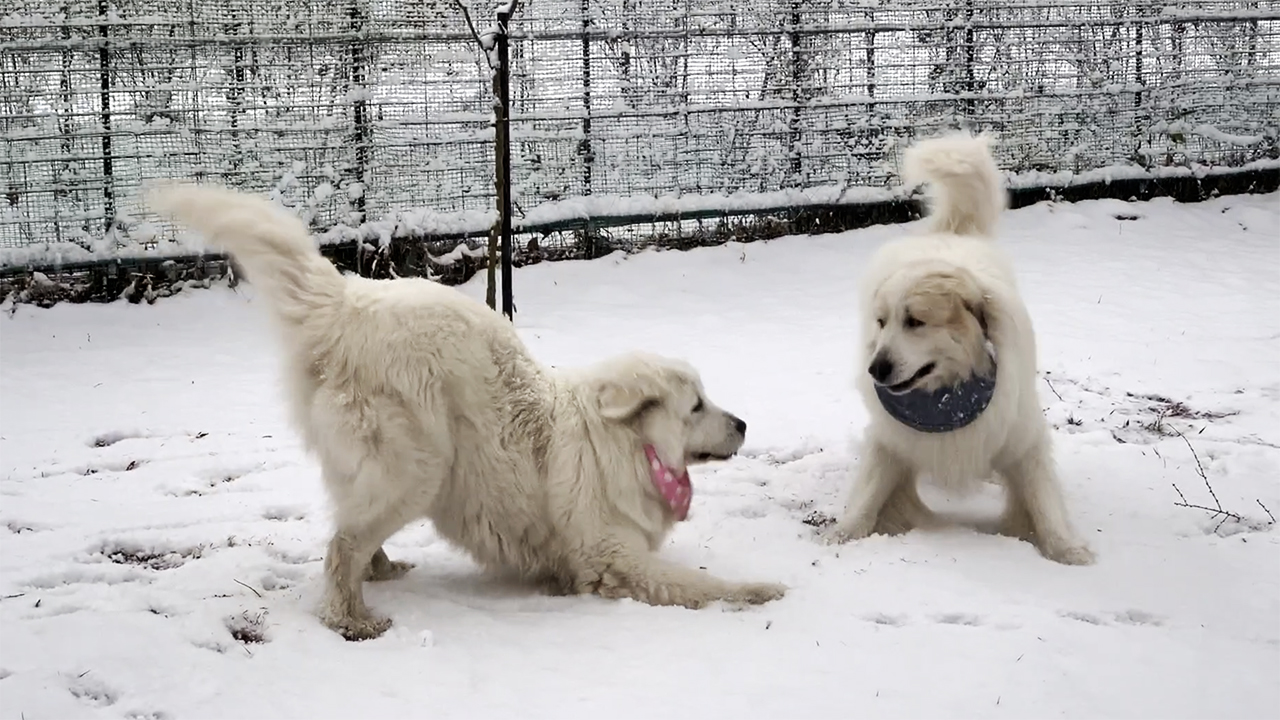 グレートピレニーズは元々フランスのピレネー山脈の高地で羊の番をしている犬です。寒いのは得意で、ルンルンもアランも外がマイナス10度ぐらいでも平気で飛び回り、また雪の中で寝ています。流石に一晩外にというわけには行きませんが、冬でも外で過ごすことが多いです。