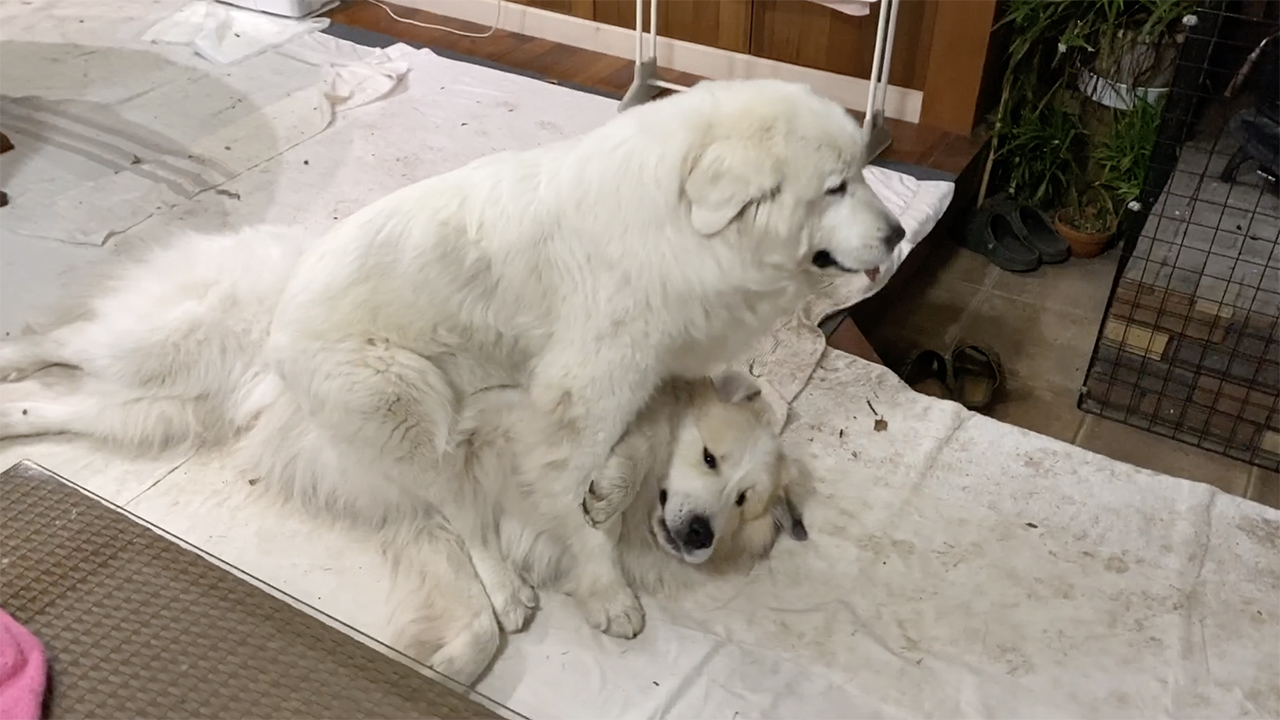 犬の世界は縦社会。定期的にアランにマウントして自分の立場を示すルンルンです。マウンティング行為はメスもやります。ルンルンは自分の方が先住犬で先輩なので立場が上だと思っているようです。アランもちゃんとわきまええているようで抵抗はしません。