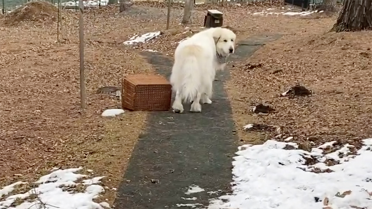過去には5kgもある漬物石を引きずって運んだ事のあるアランにとって籠はお手の物だったようです。重たいものは脚の上に落としたり、歯が欠けてしまったりするのが怖いので人間が管理を徹底するしかありません…
