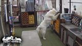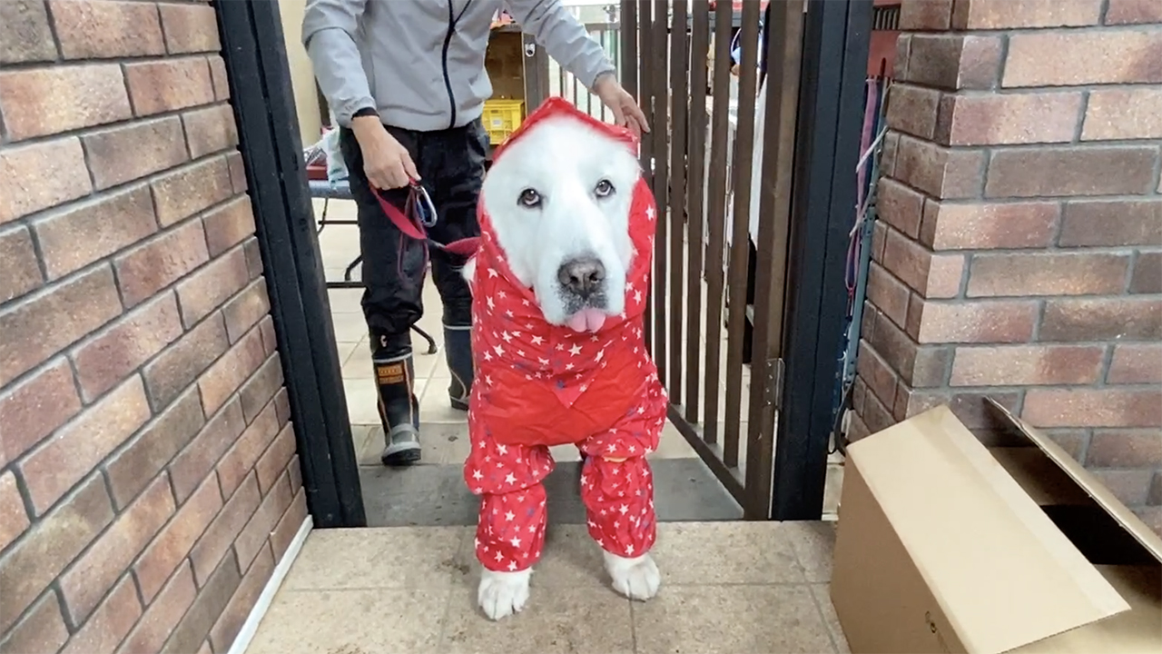 グレートピレニーズは毛が長いので濡れてしまうと乾かすのが大変です。雨降りの日は雨の合間をみて散歩へ行くのですが、止む気配の無い日は雨ガッパを着てお散歩へ行く時もあります。今日は二頭ともカッパを着てお散歩へいきました。