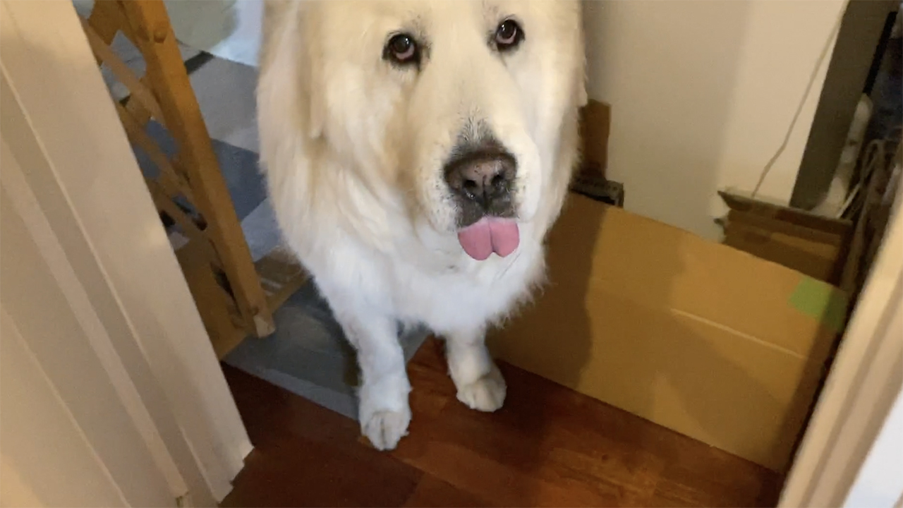 雨降りで退屈なのでお母さんを呼びに来たルンルンです。部屋の扉をノックしてなでてもらい、最後はおやつをもらいました。先日、可愛いお友達から素敵な絵をいただきました。ありがとうございました。