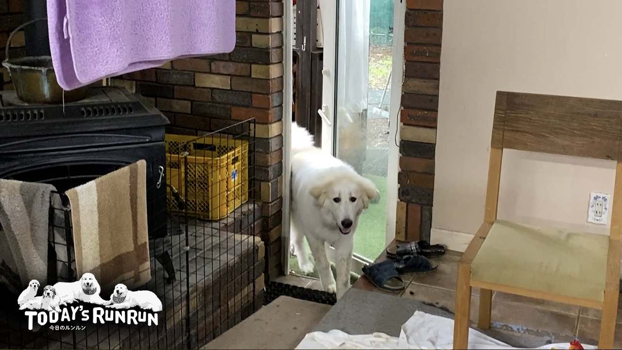 ルンルン家には薪ストーブの横に家と庭を繋ぐドアがあります。家の中から外へ行くのはドアを押せば簡単に開くのですが、外から中に入る時にはドアを引っ張って開けないといけません。アランとベルは自分でドアを開けて入ってきますが、リリーもついにドアの開け方を覚えました!
