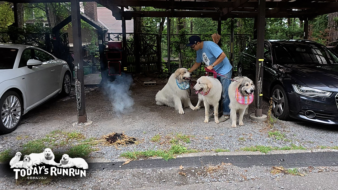 お盆の迎え火を焚いてご先祖様とルンルンをお迎えしたアランとベルとリリー。ベルとリリーが騒がしすぎてルンルンはビックリするかもしれません。