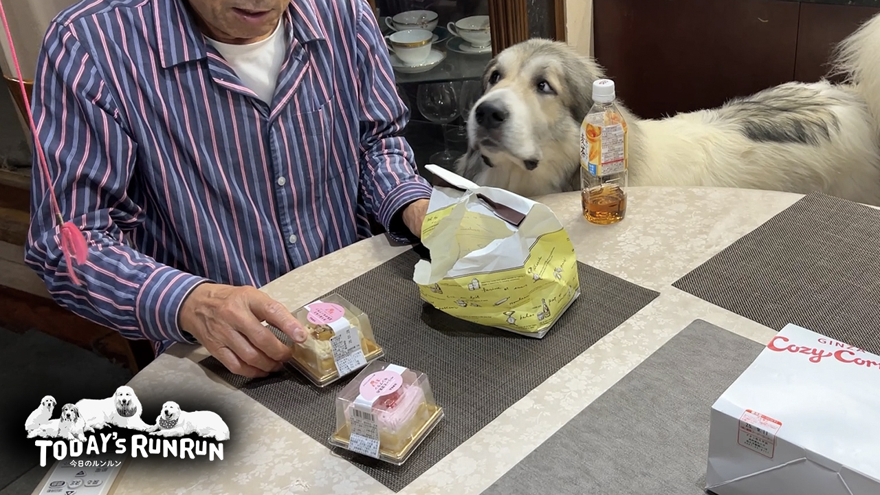 ベルはケーキだとわかるとすぐに自分の食事の場所へ移動しビシッと姿勢を正して待機の体制に入りました。ベルは食べ物には目がなくてとにかく食べるのが好きです。食が細い日はほぼなく、食事もケーキも一瞬で食べてしまいます。この日のケーキもお父さんが器を食台に置くか置かないかのタイミングでペロリと平らげてしまいました。