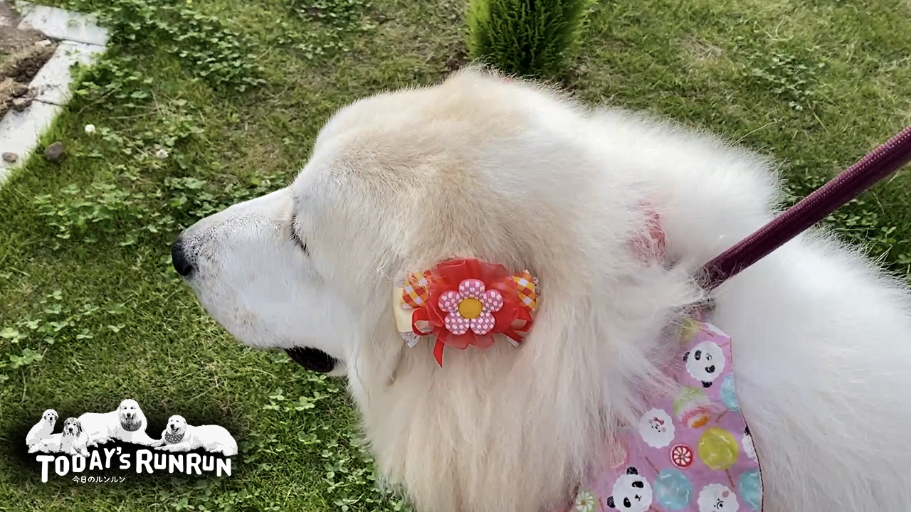 同日シャンプーで同日リボンになったベルとリリー。お転婆な二人ですが可愛らしいリボンもなかなか似合っています!せっかく付けたリボンですが帰宅と同時にベルは片方を自分で取ってしまいました…
