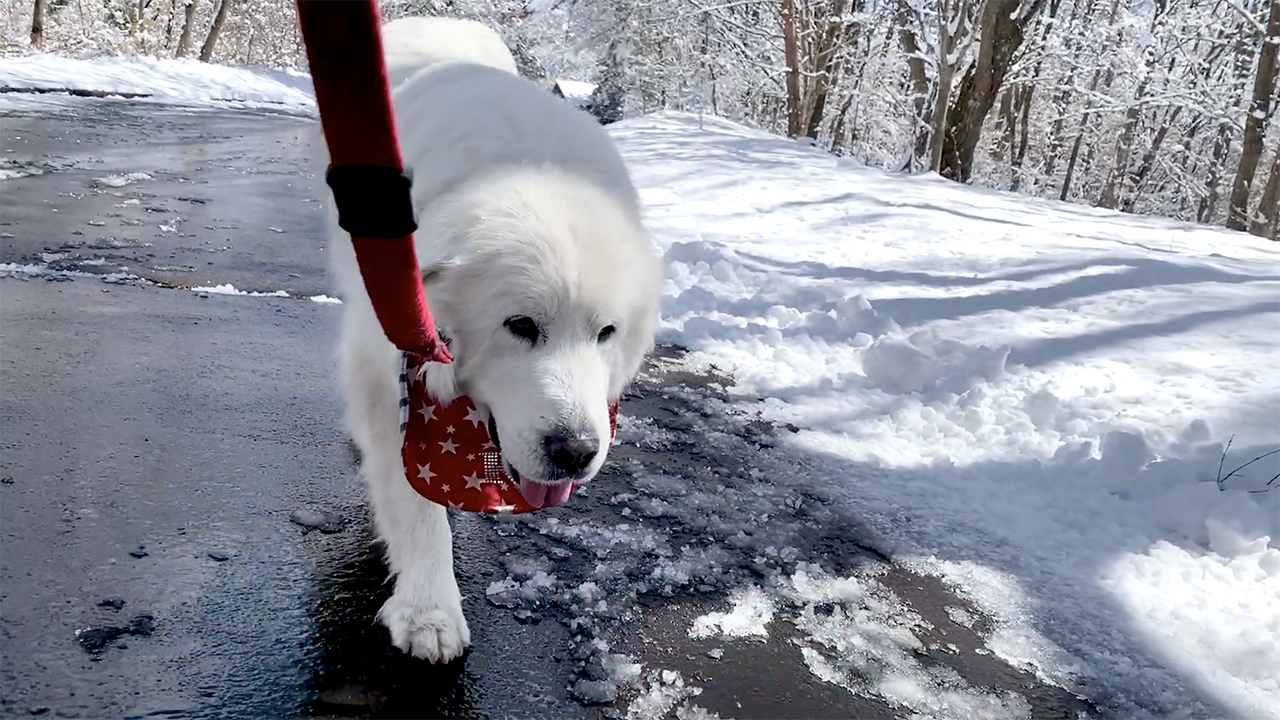 雪が上がり青空が広がって目が開けられないほど眩しい白銀の散歩道でした。雪解けの水で道路もキラキラ光っていました。寒くて快適なので元気に歩いたルンルンとアランです。