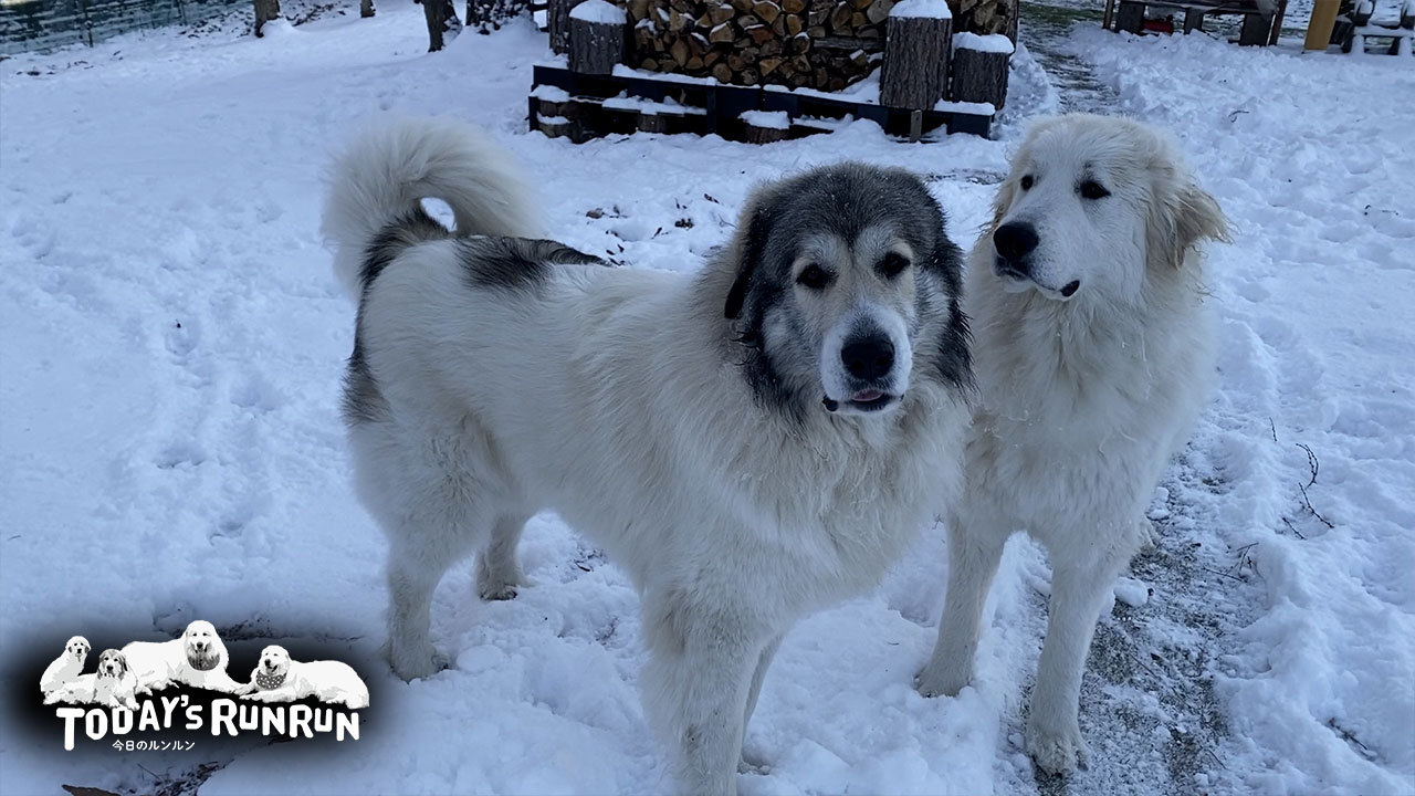 寒いのは大得意なグレートピレニーズ。雪が降るとインドア派のアランも外でのんびり。ベルとリリーは大はしゃぎです!